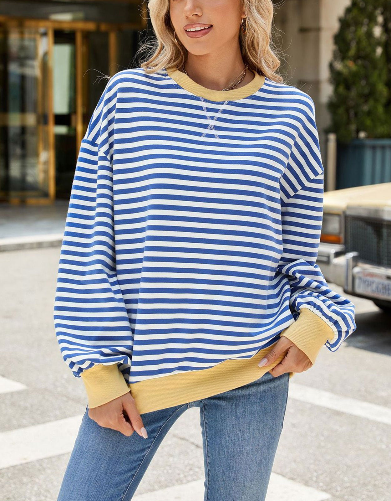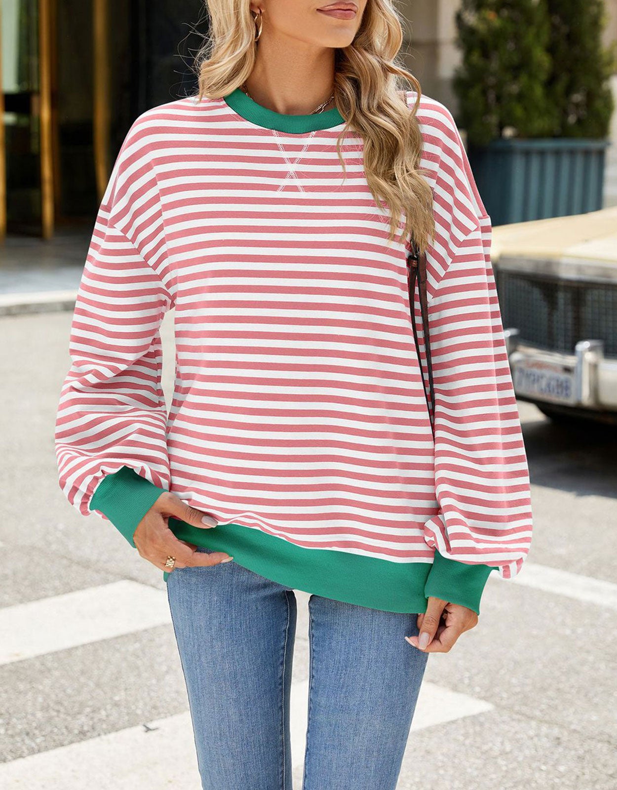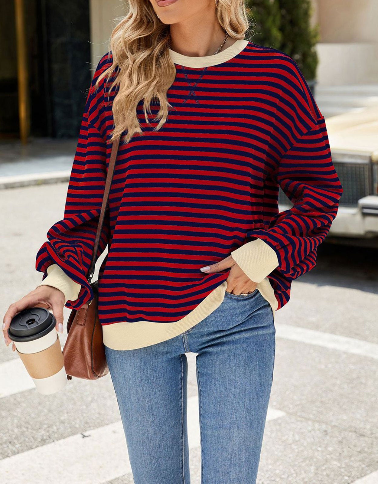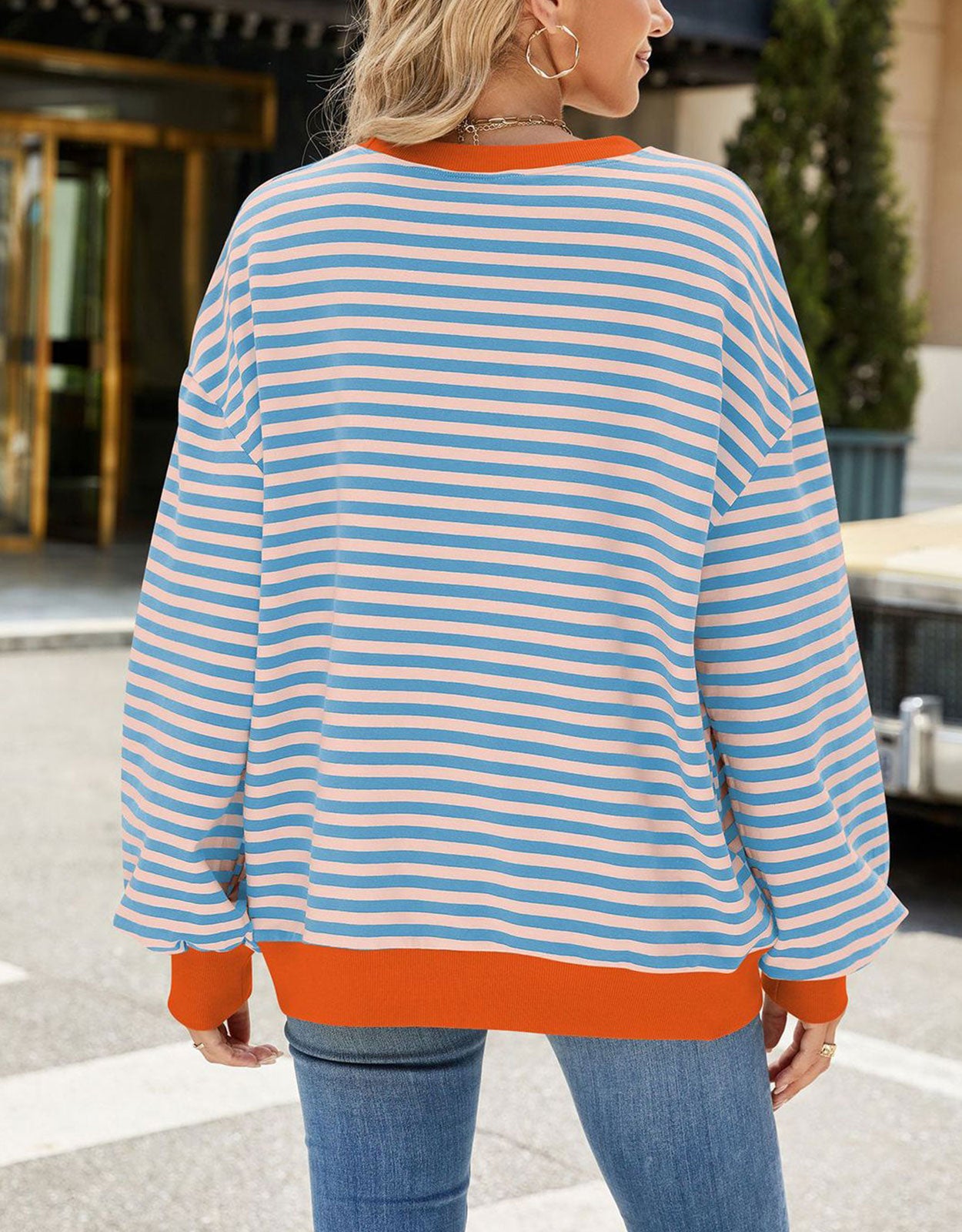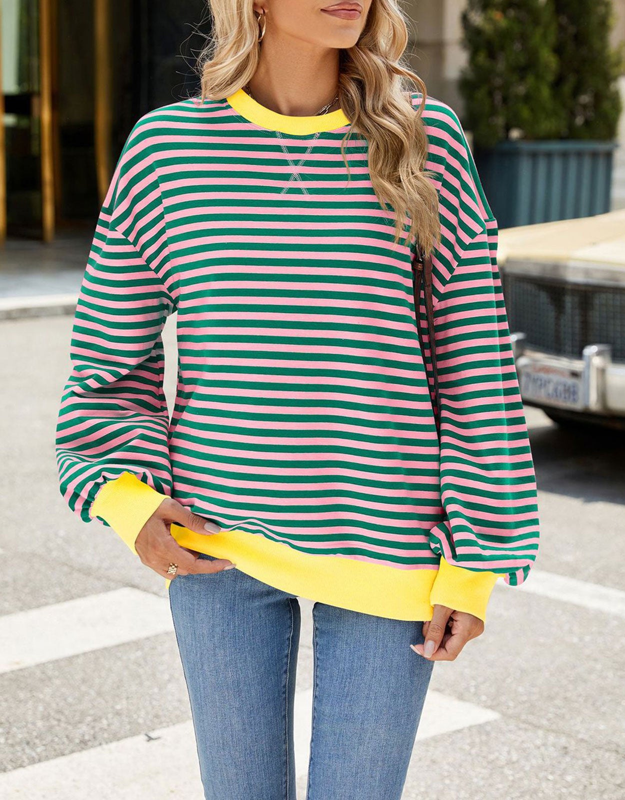 ❤Features: long sleeve shirts,crewneck sweater, striped pattern, slight color block design at the sleeves and bottom, loose style with a chic look,womens sweaters,womens clothes<