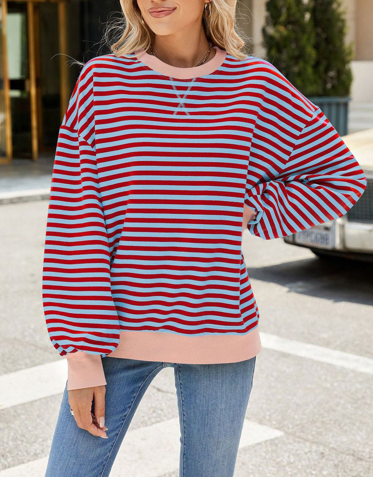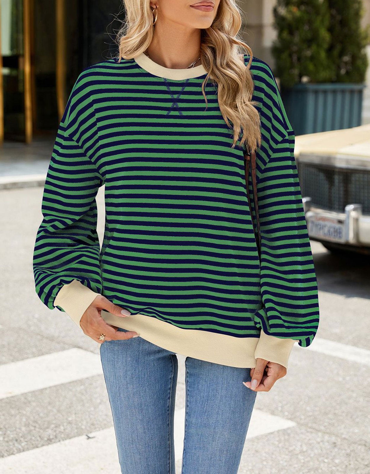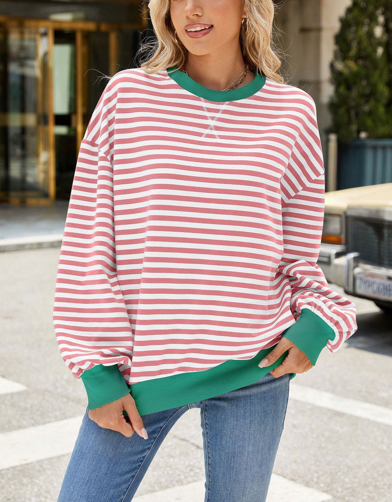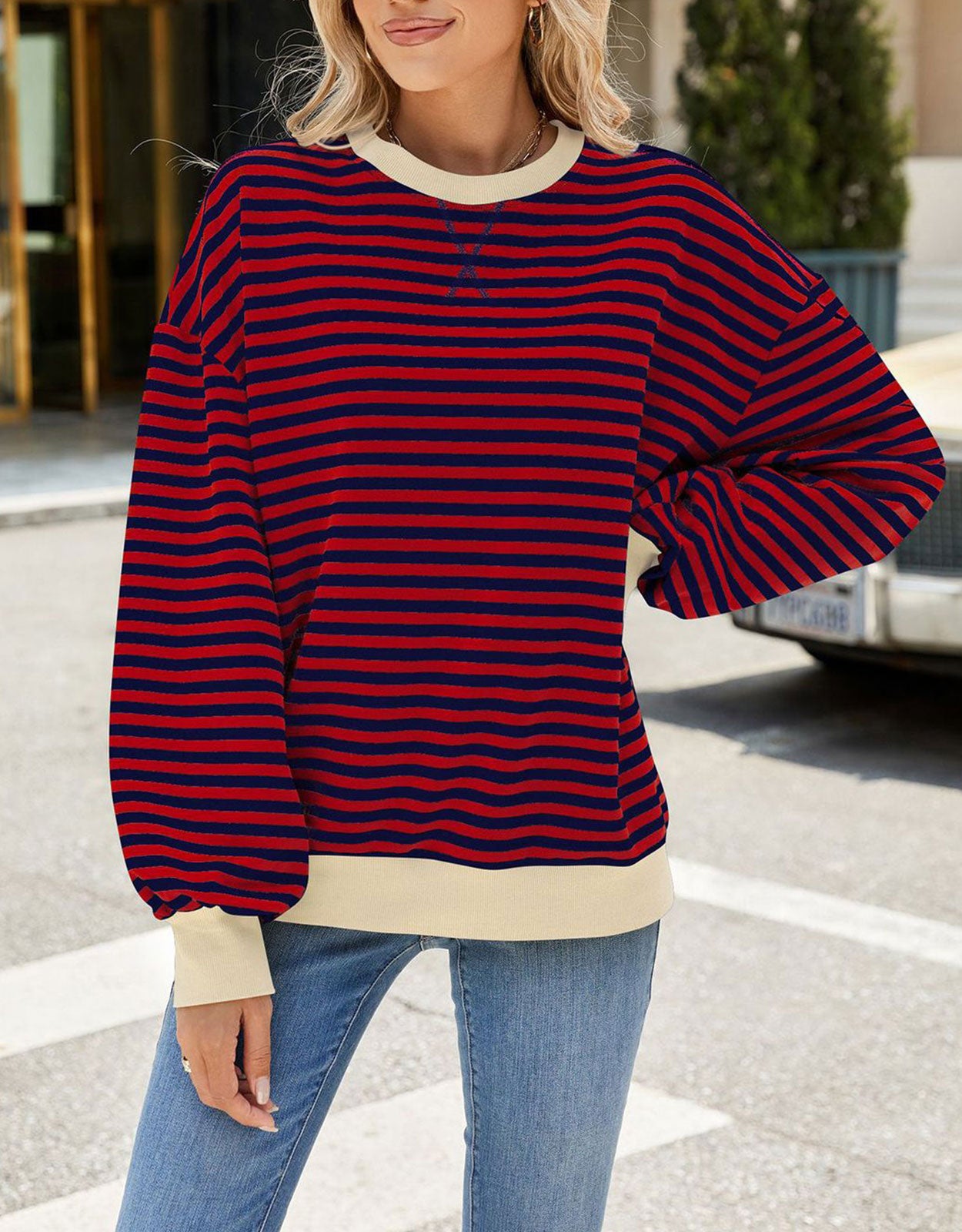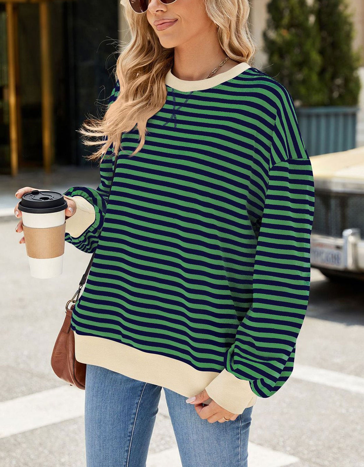 ❤Features: long sleeve shirts,crewneck sweater, striped pattern, slight color block design at the sleeves and bottom, loose style with a chic look,womens sweaters,womens clothes<