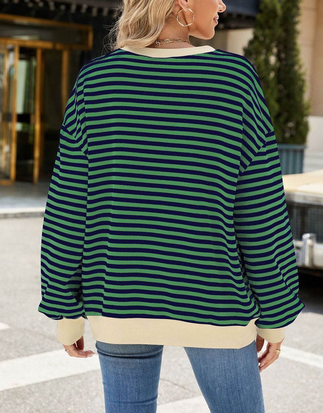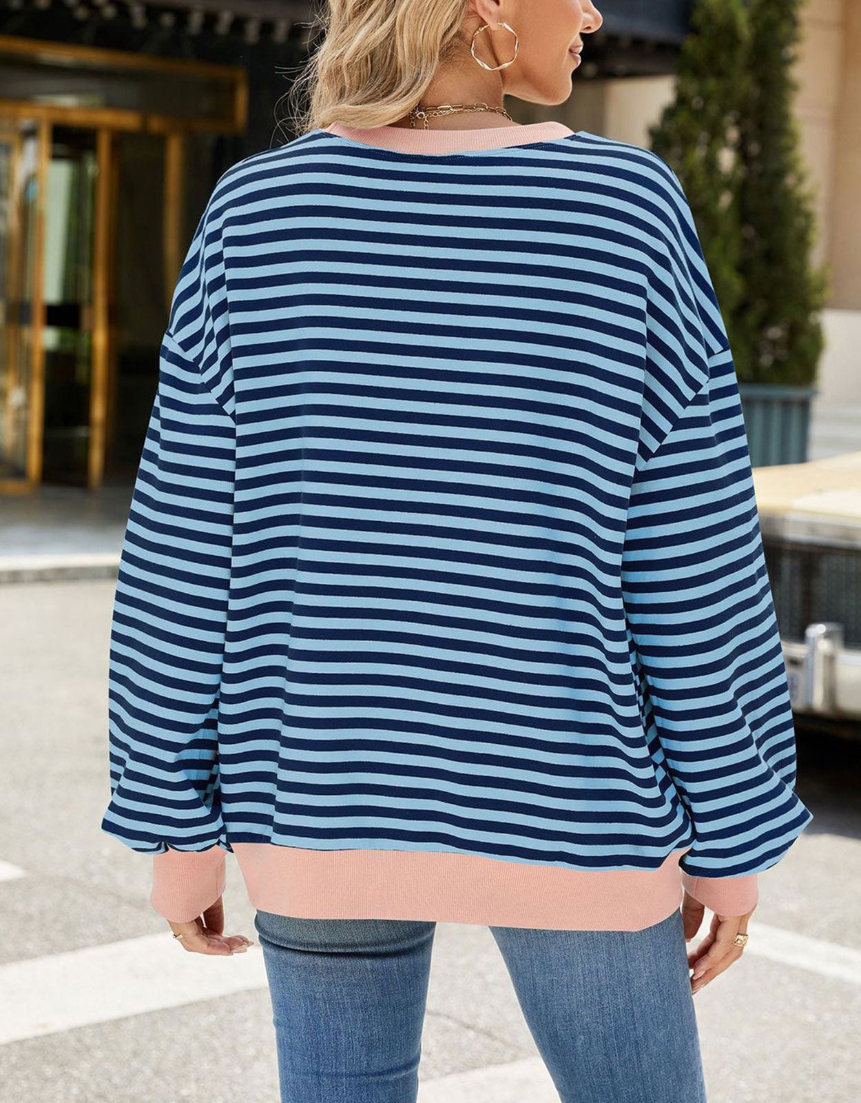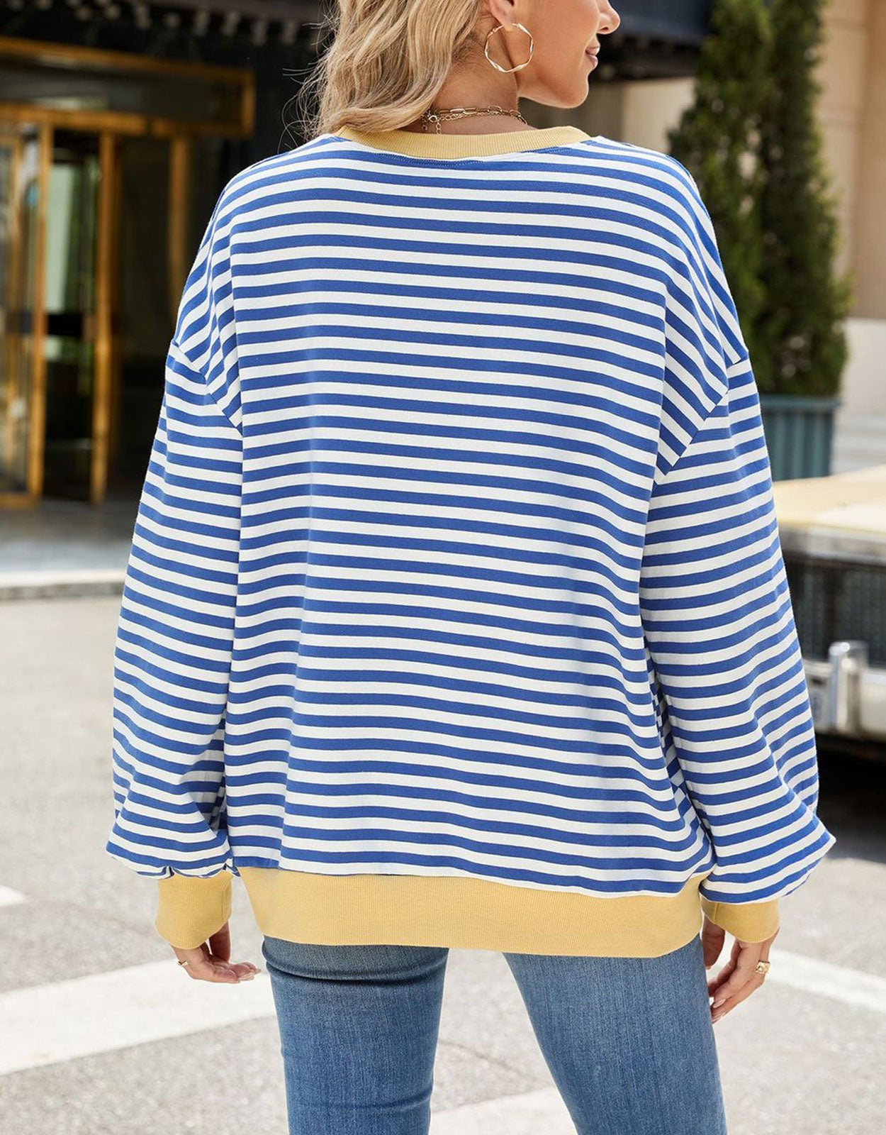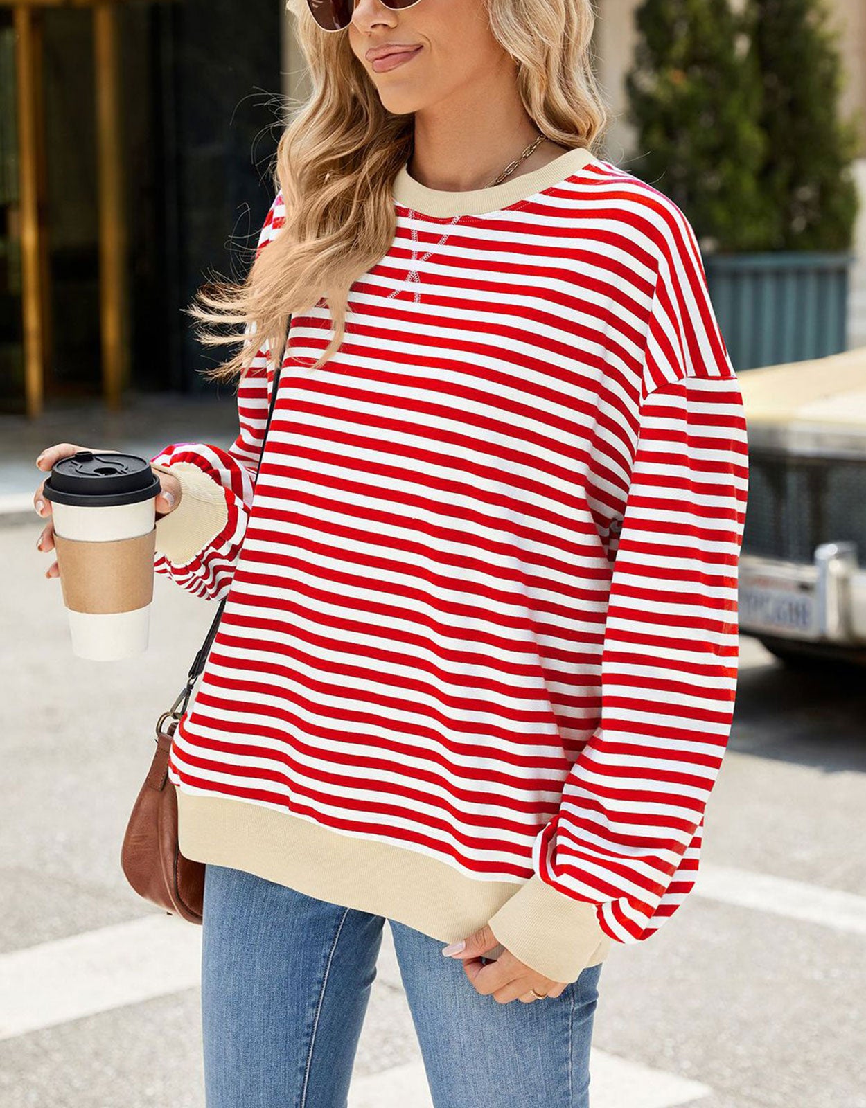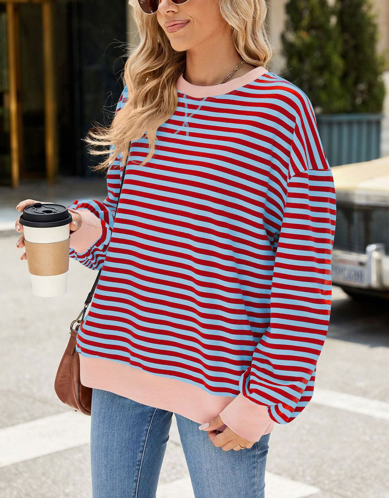 ❤Features: long sleeve shirts,crewneck sweater, striped pattern, slight color block design at the sleeves and bottom, loose style with a chic look,womens sweaters,womens clothes<