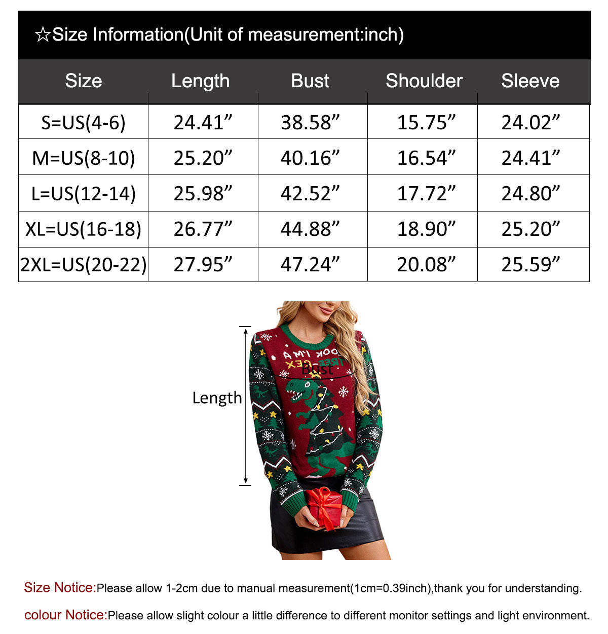 2XL=US(20-22)---Length 27.95"-----Bust 47.24"----shoulder20.08"---sleeve25.59"