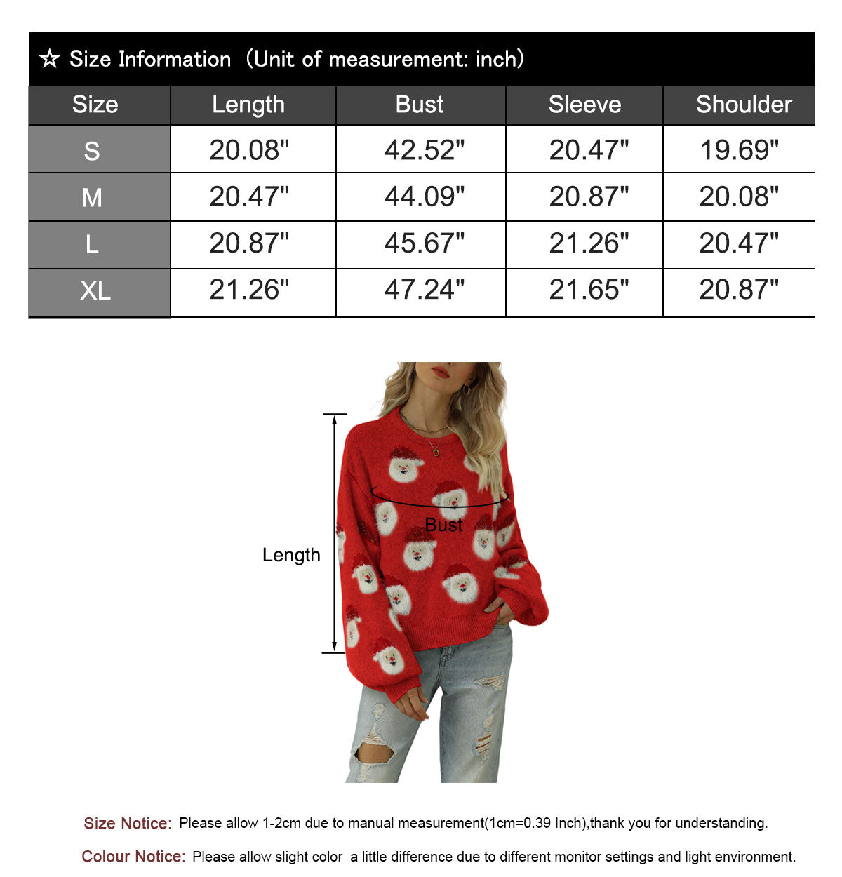 XL---Length 21.26"-----Bust 47.24"---Sleeve 21.65"---shoulder20.87"
