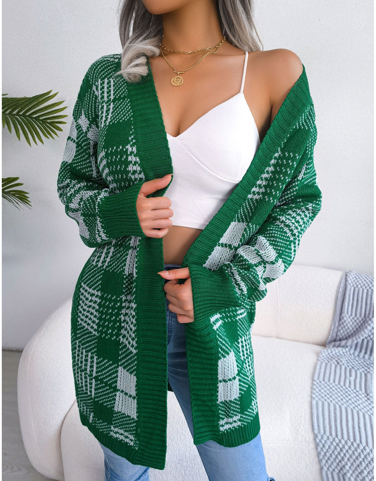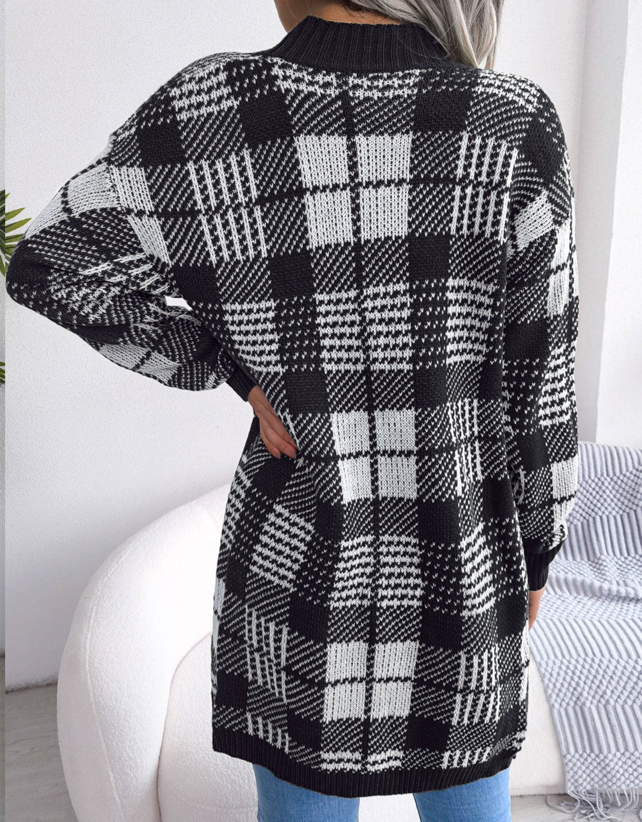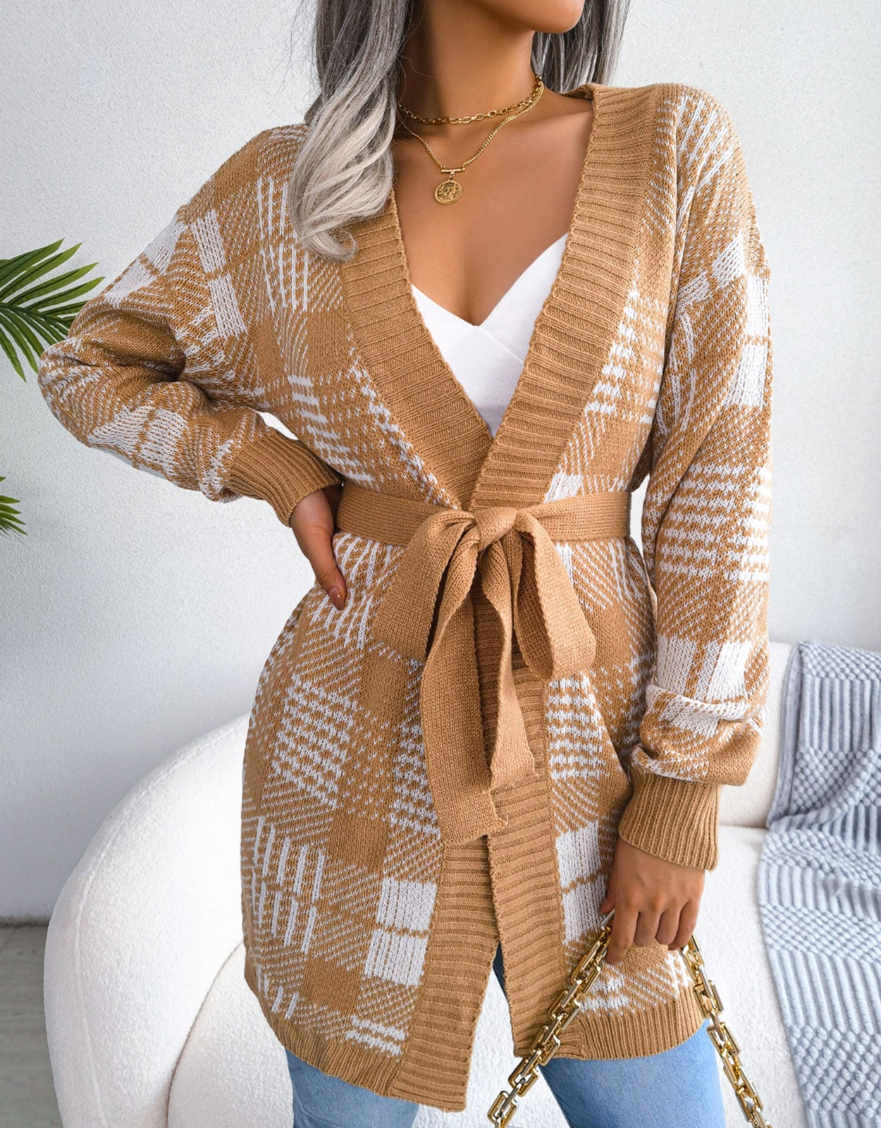 Plaid Tie Lantern Sleeve Casual Cardigan Sweater