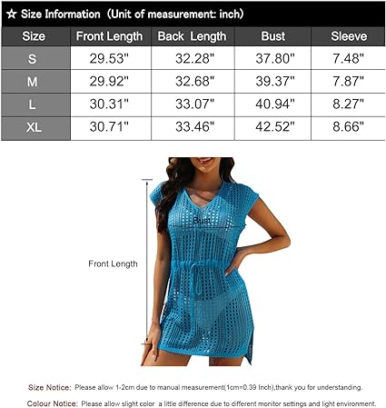 - Features: Swim cover up for women design with short sleeve, v neck,side split hem, above knee length,adjuable waist drawstring,not just easy to put on and take off,but also match with most body type and shows your elegant and gentle style