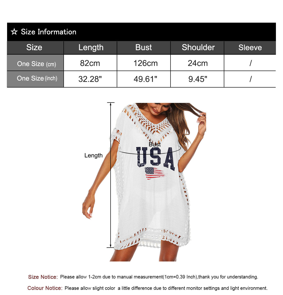 One Size---length 32.28""---Bust 49.61""--shoulder9.45""