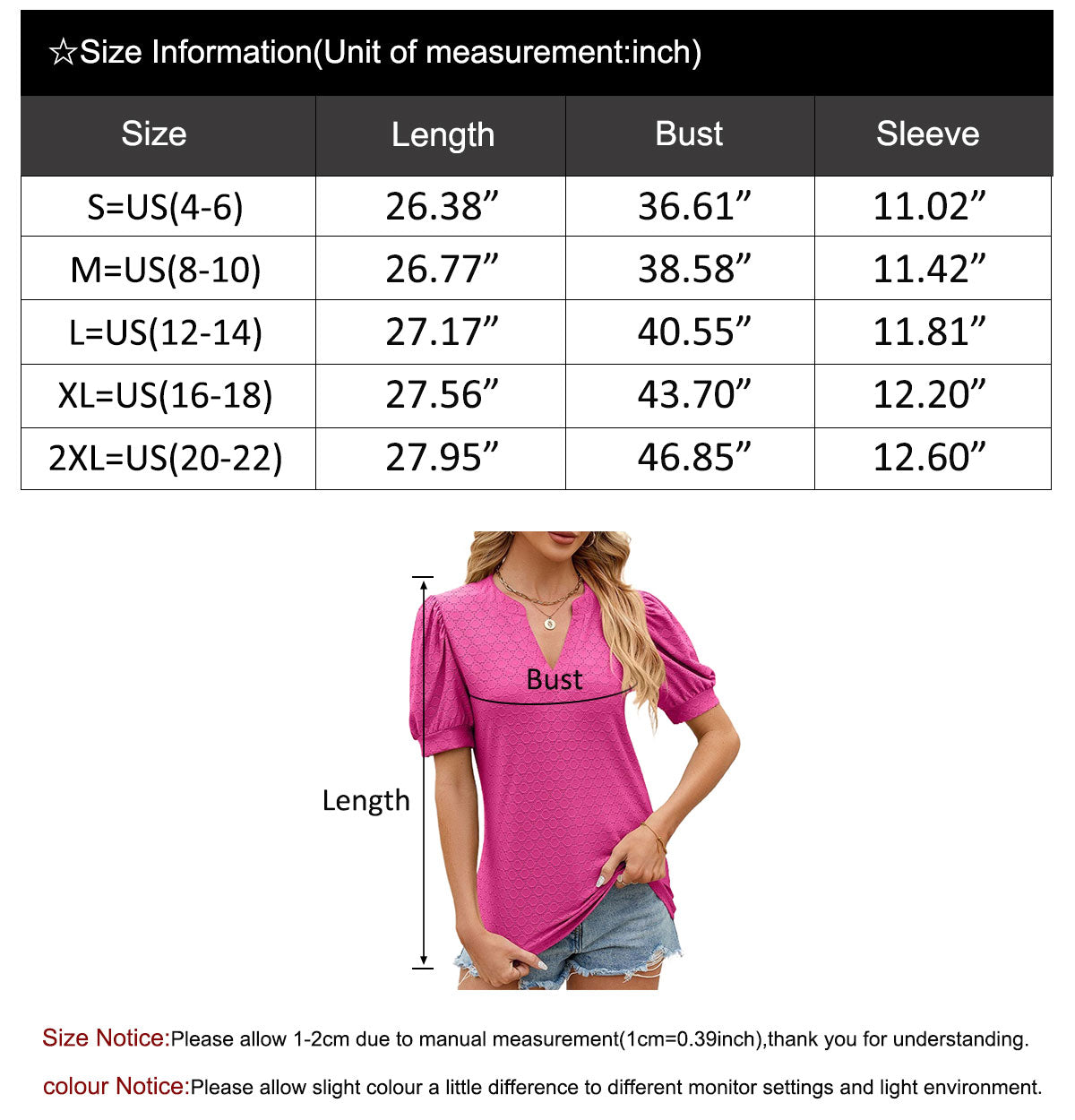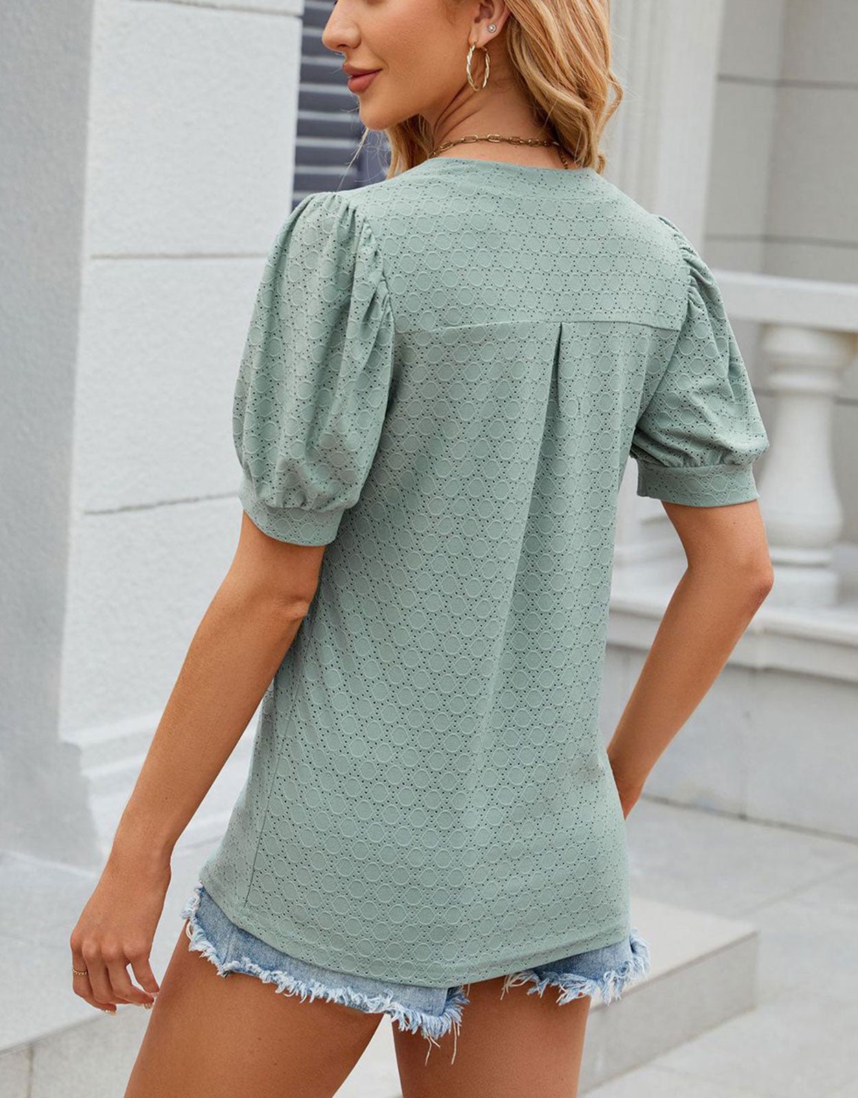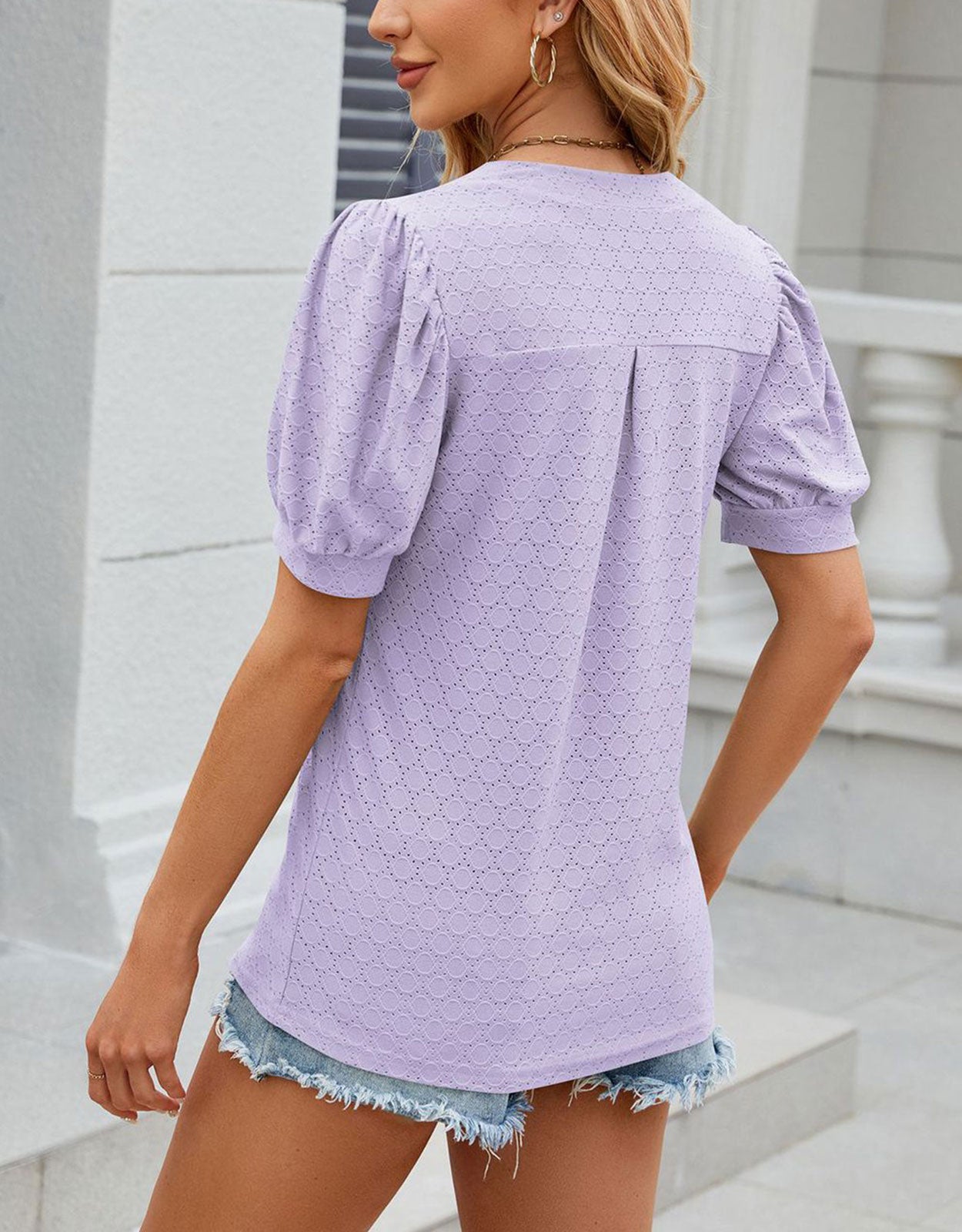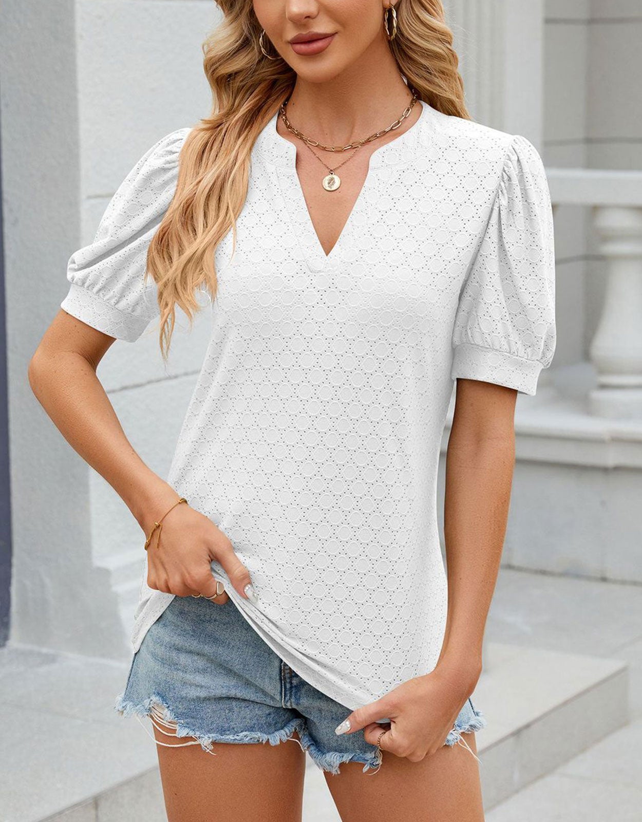 V-Neck Cute Puff Sleeve Eyelet Blouses