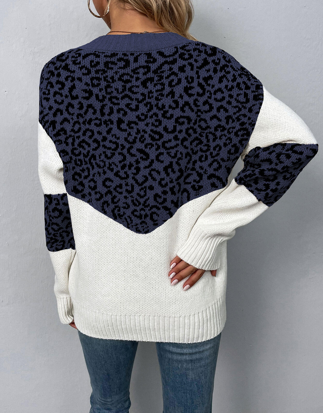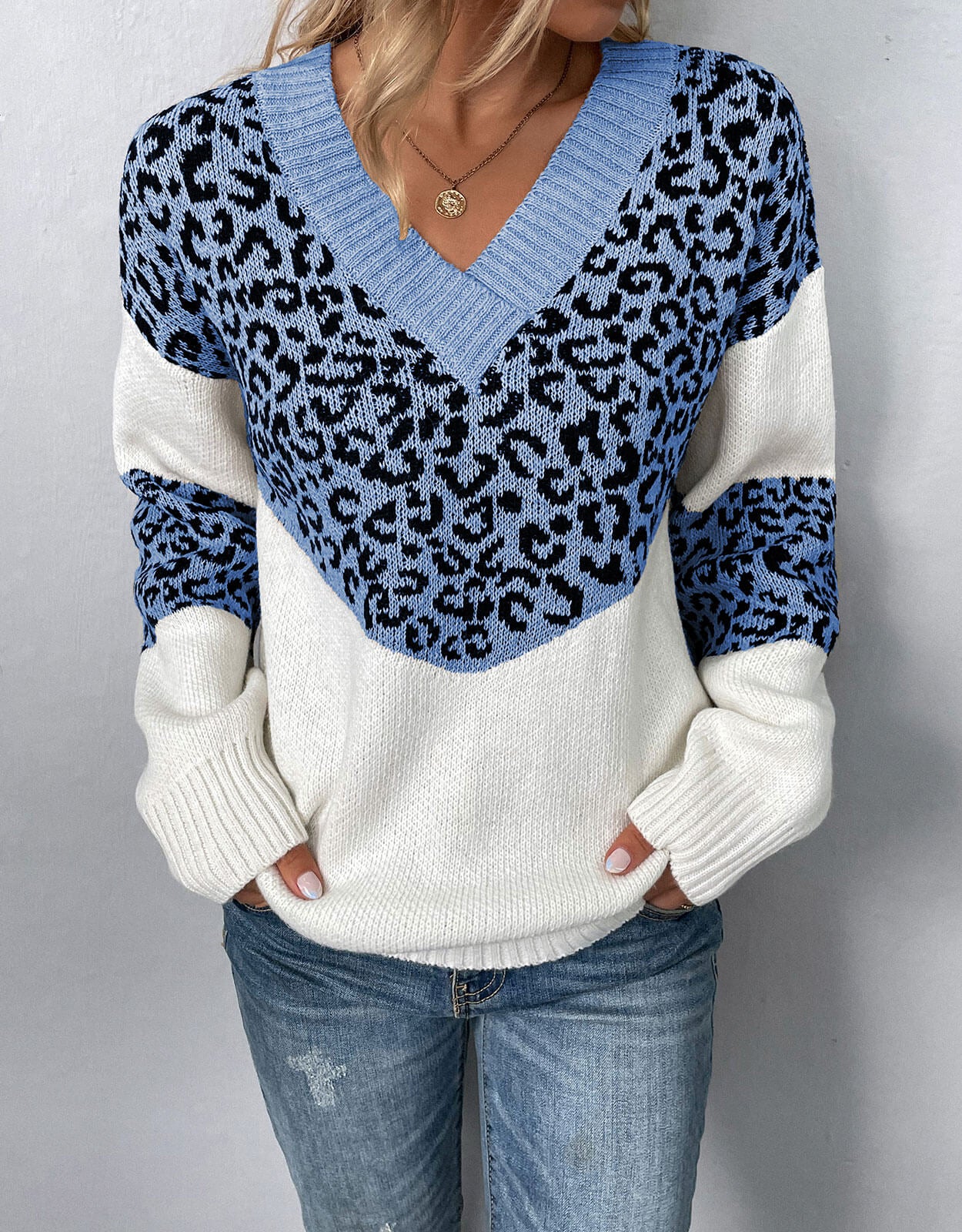 V-Neck Pullover Leopard Knit Sweater